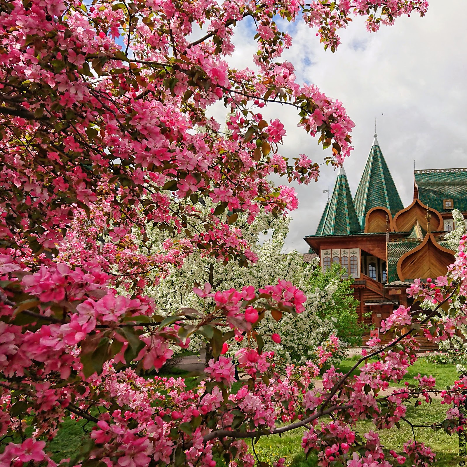 Деревянный дворец царя Алексея Михайловича и цветущий сад Коломенского парка, Москва / Wooden palace of Tsar Alexis and booming garden of Kolomenskoye Park, Moscow
